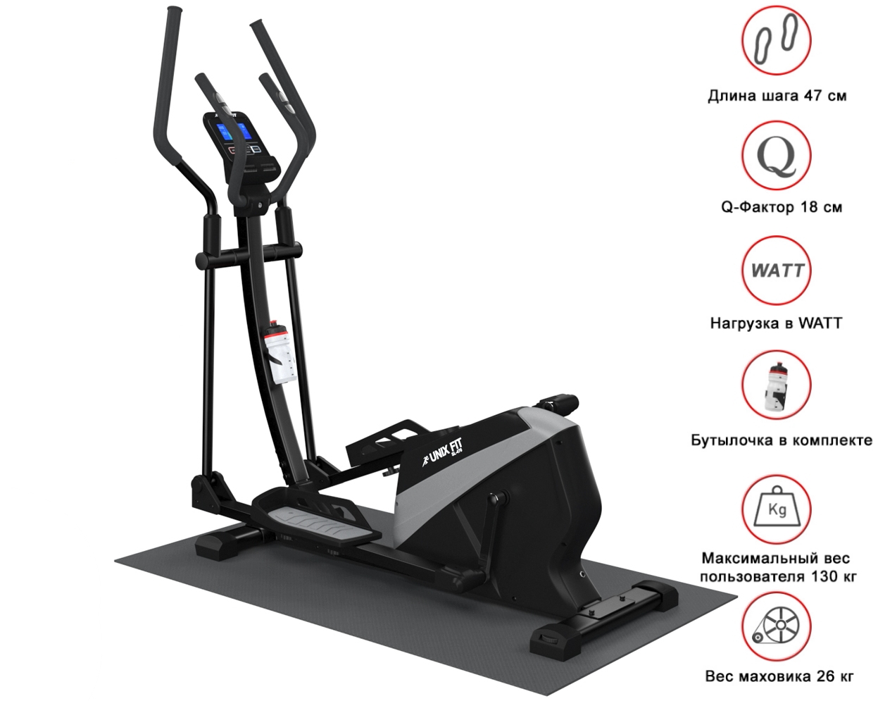 - Эллиптический тренажер с длиной шага 47 см и расстоянием между педалями 18 см (Q-фактор) обеспечивает плавное и естественное движение, минимизируя нагрузку на суставы и предотвращая возможные травмы.