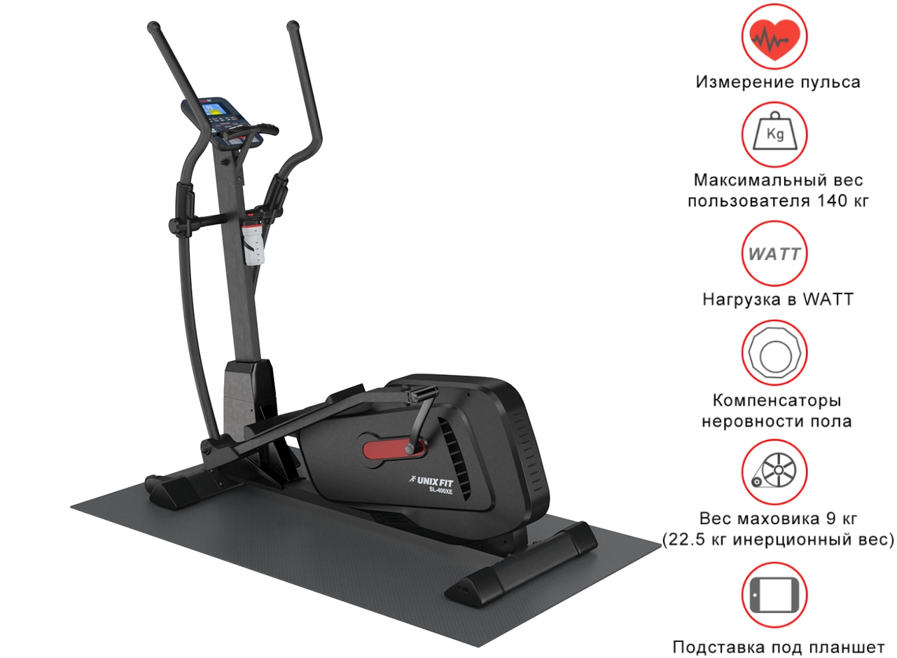 Электромагнитный эллиптический тренажер UNIXFIT SL-400ХЕ совмещает в себе функции беговой дорожки, велотренажера и степпера, обладает усиленным трехкомпонентным педальным узлом и мощной рамой.