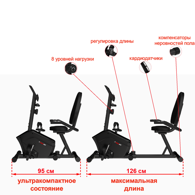 3. Правильная посадка, без нагрузки на позвоночник, создаёт комфорт и снимает нагрузку с поясничного отдела. Удобная конструкция велотренажера позволяет регулировать длину, благодаря чему пользователи с ростом до 180 см легко подберут комфортное положение сидения.