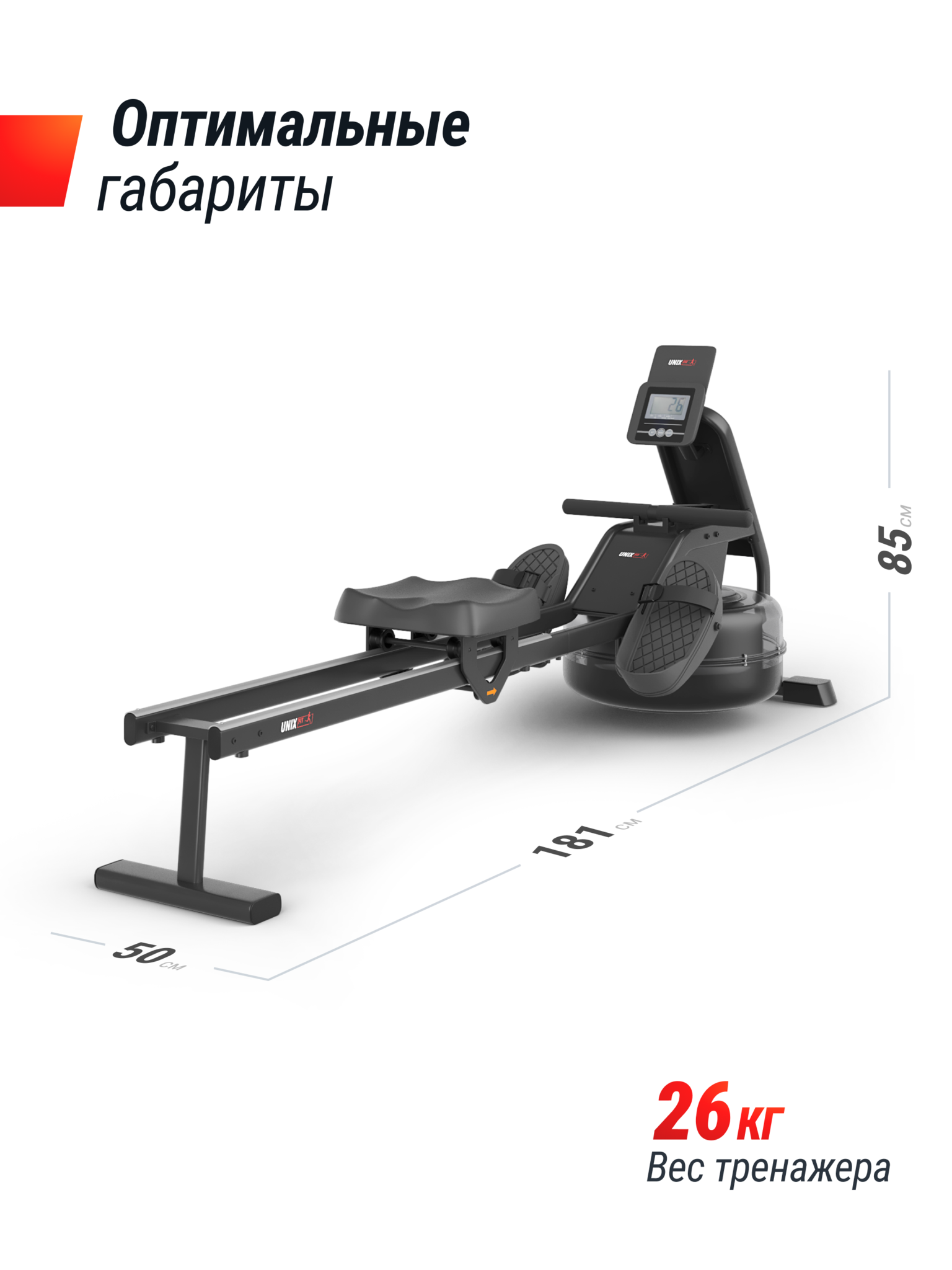 При габаритах 181 х 50 х 85 см в рабочем состоянии и весе в 26 кг, спортивный тренажер рассчитан на рост пользователя до 190 см. Для удобного перемещения и хранения оснащен транспортировочными колесами. Хранить спортивный инвентарь можно в вертикальном положении, что значительно сэкономит место в квартире. Если вы планируете хранить тренажер в вертикальном положении длительное время, рекомендуем слить из него воду. Рекомендуется дистиллированная вода.